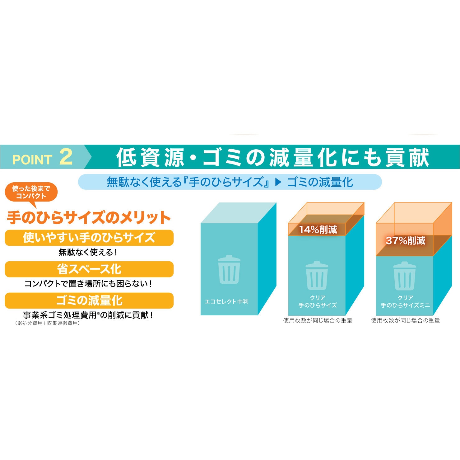 - 無駄なく使えるコンパクトサイズで、省資源化・省スペース化・ごみの減量化に貢献。